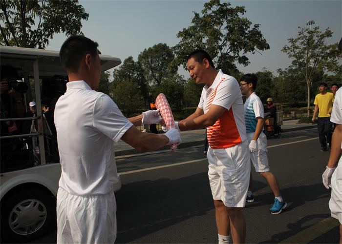 來(lái)自上虞區(qū)各界的20名火炬手開(kāi)始接力,公司董事長(zhǎng)金玉兔擔(dān)任今天火炬?zhèn)鬟f的第12棒火炬手,9點(diǎn)20分左右,三葉園林董事長(zhǎng)金玉兔身穿橙白黃相間的火炬手服裝,英姿颯爽的開(kāi)始了火炬?zhèn)鬟f,在兩名護(hù)跑手和120名隨跑人員的簇?fù)硐拢治铡昂纭被鹁嫦蛴^眾致意,伴隨著現(xiàn)場(chǎng)眾多觀眾的吶喊助威,高擎“虹”火炬,成功完成了火炬?zhèn)鬟f。