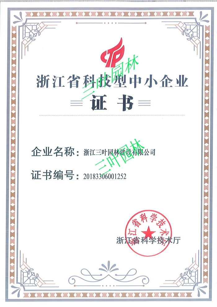 •     近日,三葉園林被評(píng)為“浙江省科技型中小企業(yè)”。為積極推進(jìn)創(chuàng)新創(chuàng)業(yè),加快培育科技型中小企業(yè),省科技廳下發(fā)了«浙江省科技型中小企業(yè)認(rèn)定管理辦法»,主要針對(duì)從事高新技術(shù)及其產(chǎn)品的研制、開(kāi)發(fā)、生產(chǎn)、銷售和服務(wù)的中小型企業(yè),把是否擁有自主知識(shí)產(chǎn)權(quán)、專有技術(shù)或先進(jìn)知識(shí)作為評(píng)審認(rèn)定的核心指標(biāo)。