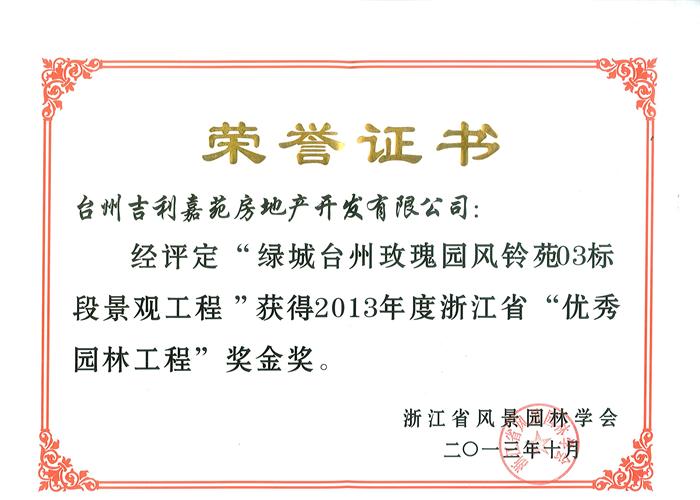 - 熱烈祝賀城臺(tái)州玫瑰園風(fēng)鈴苑03標(biāo)段景觀工程榮獲浙江省"優(yōu)秀園林工程獎(jiǎng)"金獎(jiǎng)